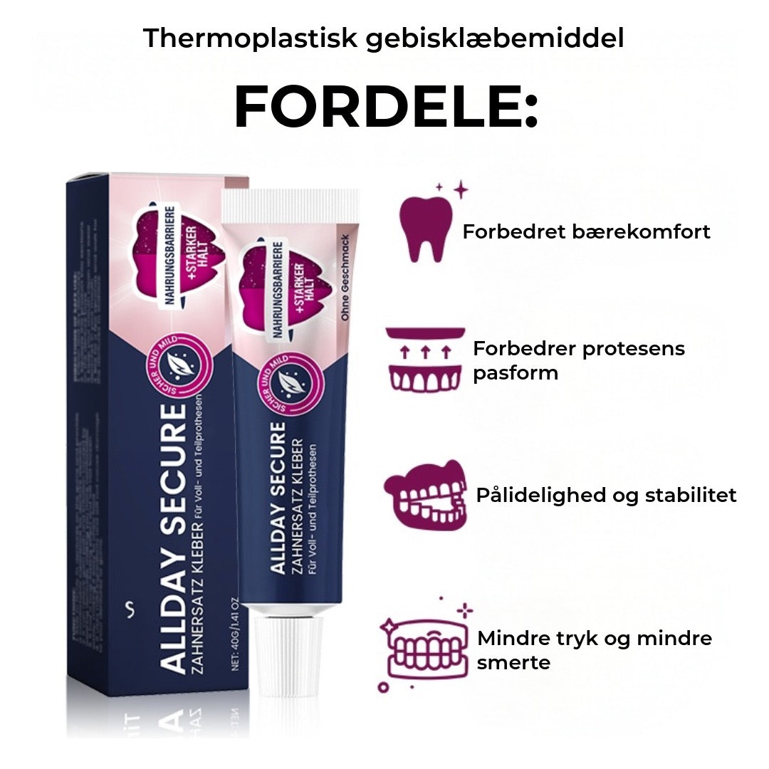 Oplev et helt nyt niveau af komfort og sikkerhed. Takket være den varmeaktiverede teknologi tilpasser limen sig præcist til tandkødets form og skaber en skræddersyet forsegling, der holder din protese solidt på plads.