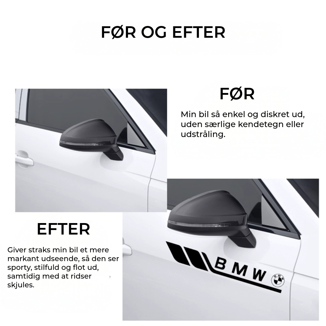 Hvert sæt indeholder 4 dekorative klistermærker i størrelsen 30 × 4 cm. Fås i sort og hvid, så de passer til næsten enhver bilfarve. Klistermærkerne er farveægte, velegnede til udendørs brug og designet til nem montering uden værktøj.